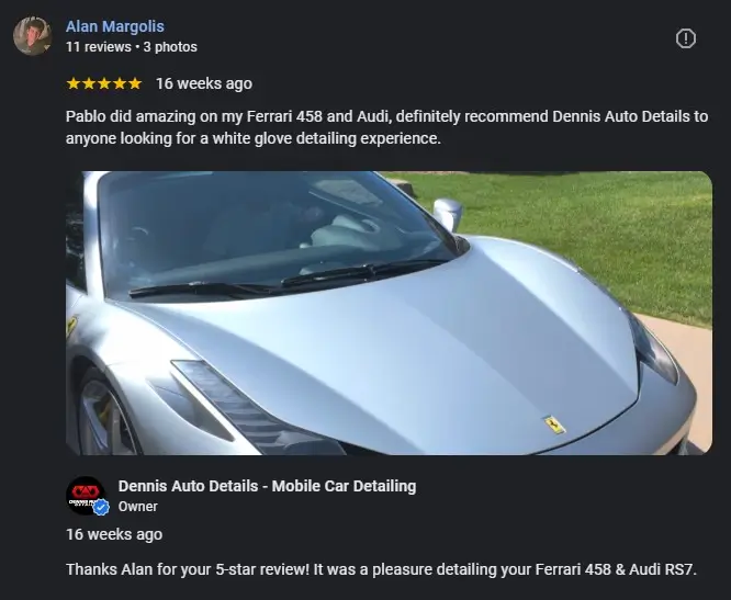 Alan Margolis from Rancho Bernardo wrote: “Pablo did amazing on my Ferrari 458 and Audi, definitely recommend Dennis Auto Details to anyone looking for a white glove detailing experience.”